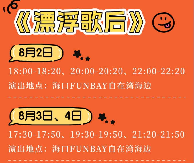 8月4日:16:30-17:00(华彩·海口湾广场)、18:30-19:00、20:00-20:30(王府井海垦广场)