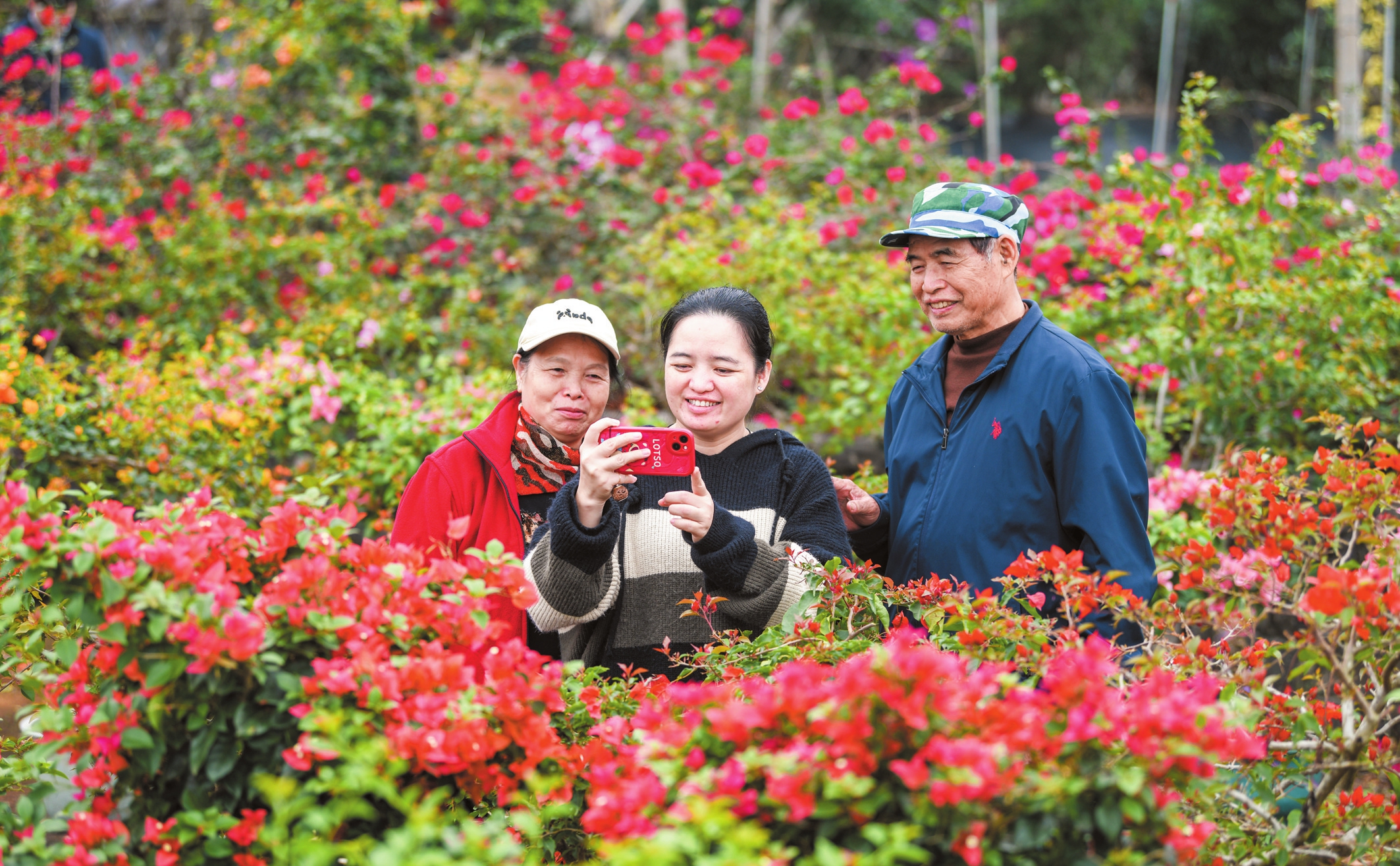 3月18日,游客在琼山区红旗镇边洋村的三角梅共享农庄赏花游玩。本报记者苏弼坤摄春日的海口,繁花似锦。秀英区永兴镇的荔枝花海如金色波浪翻滚,琼山区红旗镇边洋村的三角梅姹紫嫣红,龙华区新坡镇的兰花产业园幽