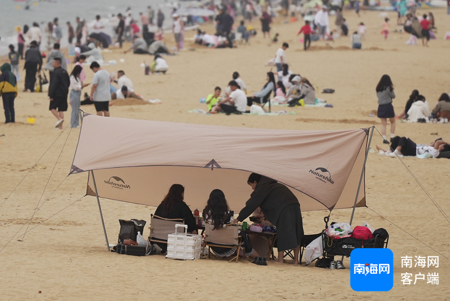 市民游客在沙滩上支起帐篷,享受假日慢生活。记者 汪承贤 摄