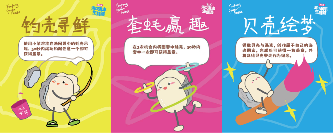 套蚝赢趣:每人每次三个圈,30s内套中一个生蚝蚝壳即算挑战成功,可获得印章一枚。