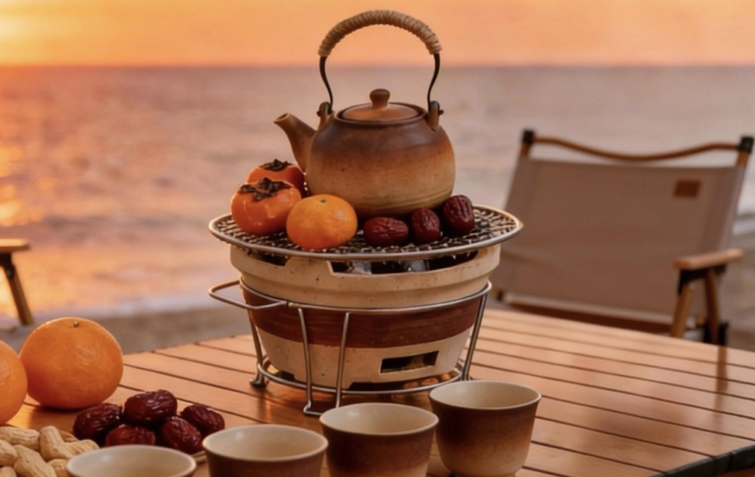 在海边支起小火炉,围炉煮茶