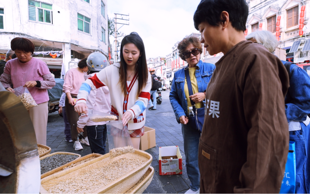 铁锅冒着热气,坚果在锅里不停翻炒,每一款干果都是现炒现卖,多种口味满足不同需求。摊主都是经营了几十年的老街熟人,来这里购买,买的不仅是年货,更是老海口的年味情怀。