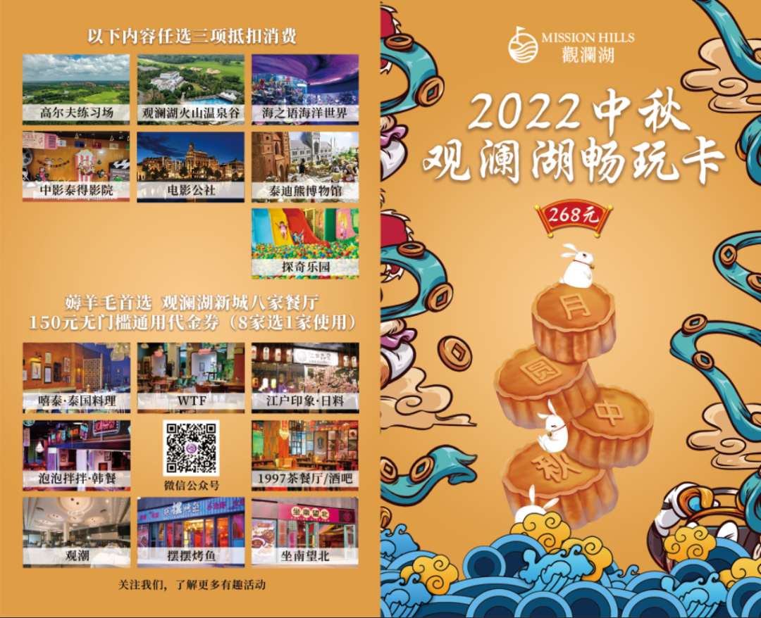 明月诗词会、古装汉服秀、猜灯谜、做糖人、投壶等,还有海口观澜湖的高尔夫、温泉、水上乐园、场馆、餐饮等多项优惠,268元/张【任选三项】使用有效期9月10日-12日。
